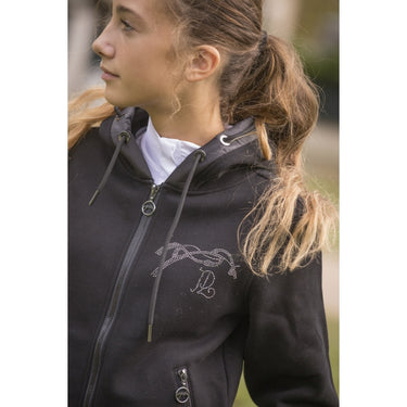 Our black Fluore sweatshirt has a zip on the front and a rhinestone Pénélope logo on the heart. It has a two-material hood from which a drawstring pulls out through two different eyelets. The Fluore sweatshirt has two zipped front pockets.