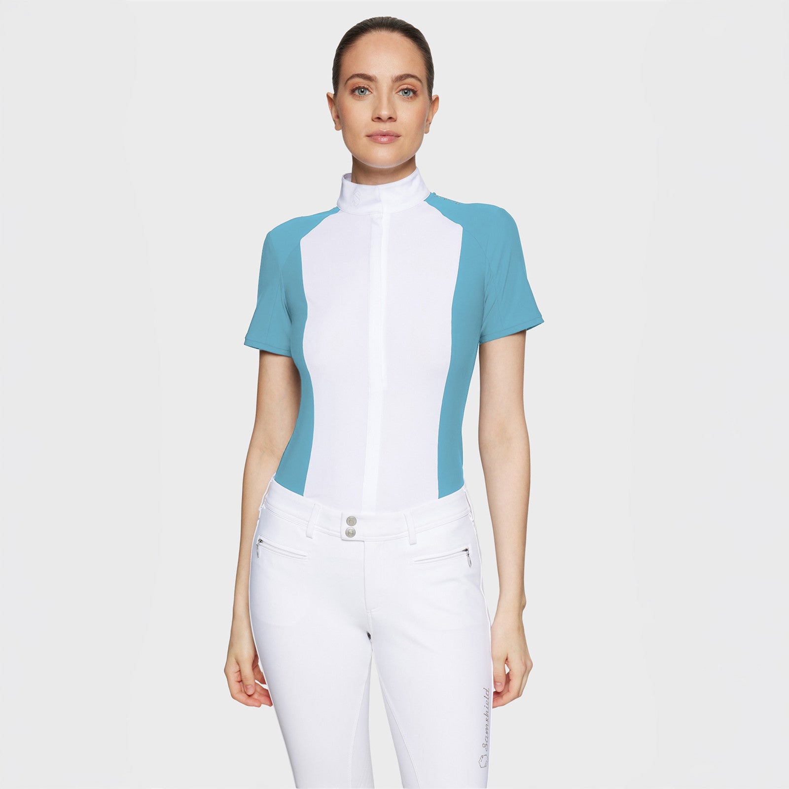 The Samshield Gretta Metal Dots Women's Short Sleeve Equestrian Show Shirt is the ultimate equestrian show shirt designed to combine style, comfort, and performance for competitive riders. Made from breathable Italian technical fabric, this women's riding shirt offers a lightweight, wrinkle free fabric that keeps you cool and polished throughout your event. With UPF 50+ sun protection, it shields you from harmful rays while maintaining a classic short sleeve fit that enhances mobility and comfort during intense show jumping or equestrian competition wear.